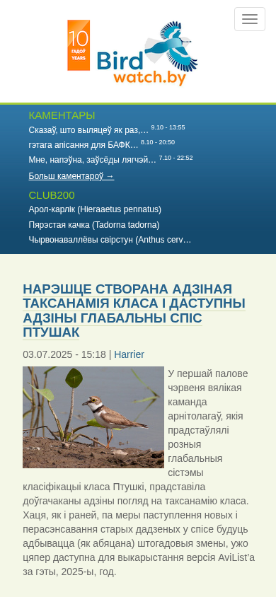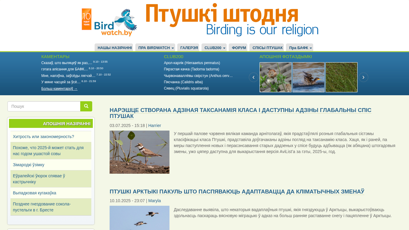 | AI-анализ | The website BirdWatch.by is dedicated to birdwatching in Belarus. It features a club section with a rare birds gallery, a rating system for the club, a list of birds observed by the club, a forum, and a section for the Birdwatching Federation of Belarus. The site includes frequent questions about birdwatching, such as the basics of birdwatching, bird identification, and the Birdwatching Club200 statistics. Users can also find comments about specific birds and their locations, as well as rare photographs. A new taxonomy classification of bird classes is available for use in the 2025 edition of AviList. The website also discusses the adaptation of Arctic birds to climate changes and the discovery of cultural artifacts in their nests dating back over 650 years. Maryla, a birdwatcher, shares her observations of various birds and their habitats, including |