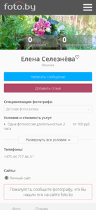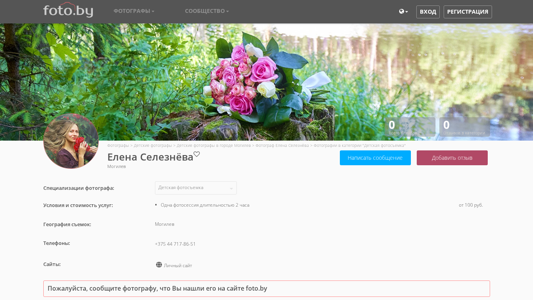| AI-анализ | The website belongs to photographer Elena Seloznova from Mogilev, Belarus. The site focuses on showcasing her photography work, particularly in the "Child Photography" category. Elena identifies herself as a child photographer, portrait photographer, and family photographer. The website includes information about her services, pricing, and contact details. Visitors can view her portfolio and leave reviews. The site is part of the foto.by network, which includes a community of photographers and a catalog of various photography categories. |