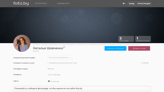 | AI-анализ | This online resource is a photography portfolio website of Natalia Shvchenko, a photographer based in Mogilev, Belarus. The main focus of the website is on photography in the category "Newborn Photography." The photographer specializes in newborn, child, maternity, and family photography. The website includes a catalog of photographers, with Natalia Shvchenko listed under "Photographers in Mogilev." The website offers information on the photographer's services, pricing, and contact details, including a phone number and personal website. The website also features a community of photographers and a blog. The website received 1 visit on March 5, 2025, and has 3 reviews in the newborn photography category. The photographer's specialties include newborn photography and child photography. The website provides information on the photographer's pricing, which starts at 3 |