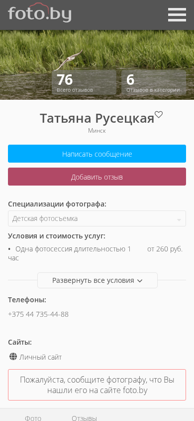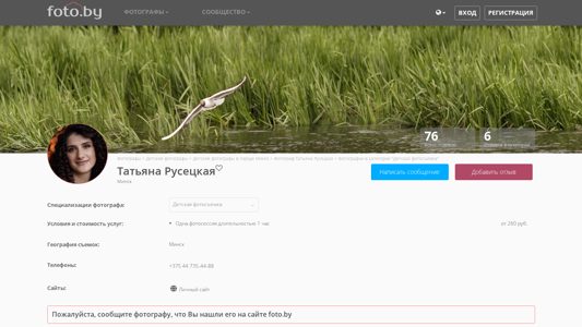 | AI-анализ | The website is a photography portfolio of Tatiana Rusetskaya, a child and family photographer based in Minsk, Belarus. The homepage displays a catalog of photographers, with Tatiana's profile and her category "Детская фотосъемка" (Child Photography) highlighted. The site offers services for various photography genres including child, family, portrait, and reclamation. Prices start from 260 rubles for a one-hour session in Minsk. The photographer's contact information and links to her personal website are provided. |