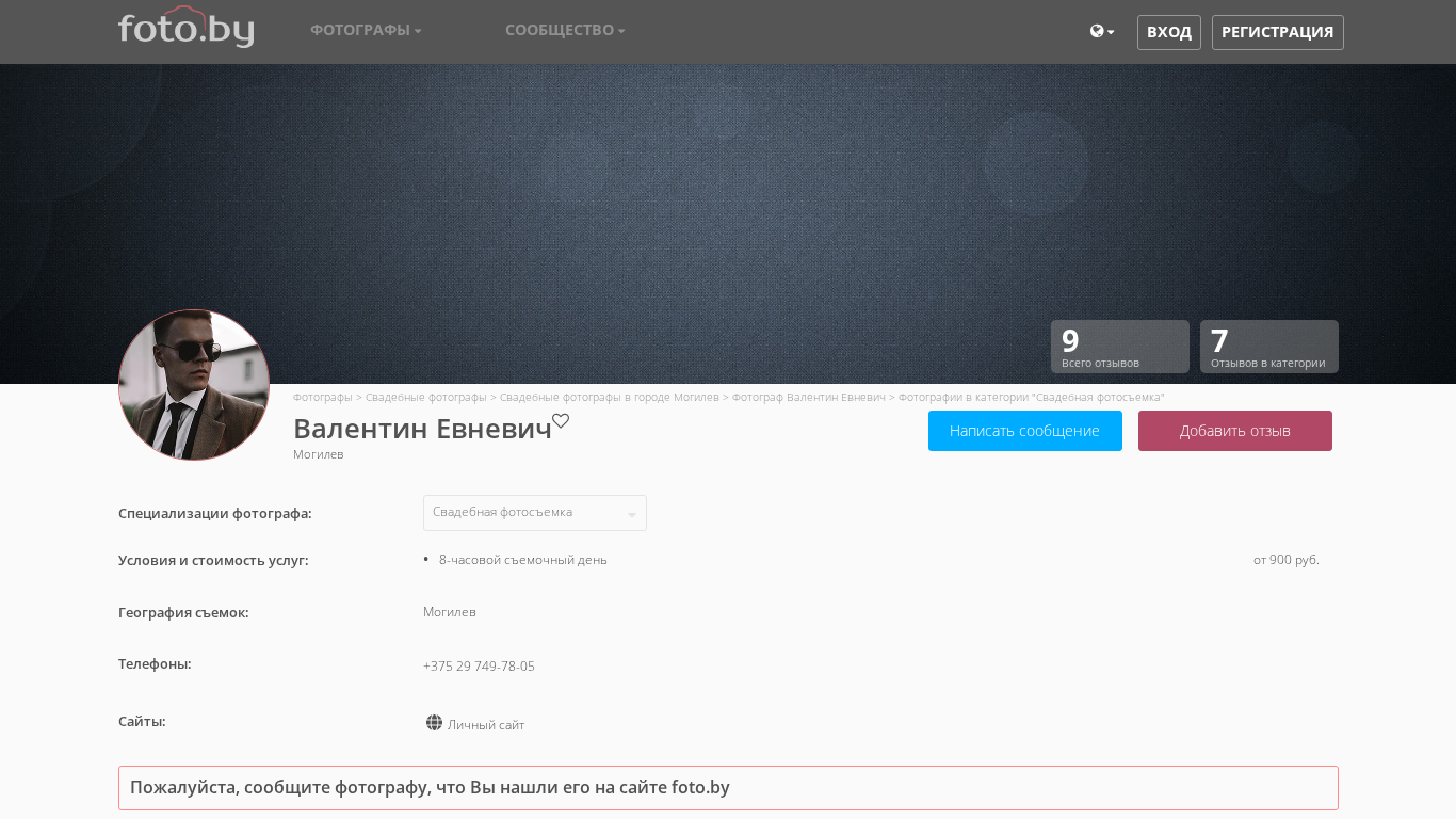 | SEO-описание | Фотографии в категории "Свадебная фотосъемка". Сайт фотографа Валентин Евневич. Я работаю как свадебный фотограф в городах: Могилев,Минск,Гомель,Витебск,Мозырь,Бобруйск |