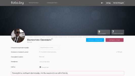 | AI-анализ | The web project "Valentin Evnevich Photography, Mogilev" is a site dedicated to the work of a photographer named Valentin Evnevich based in Mogilev, Belarus. The website features a category of photographs specifically for wedding photo shoots. Valentin offers his photography services in various cities including Mogilev, Minsk, Gomel, Vitsebsk, Mozir, and Bobruisk. The site does not provide any contact information or links within the given data. The most frequently used keywords on the site are related to photography and wedding photo shoots. The site also includes a community for photographers and a blog. The site was visited on August 10, 2021 and has received 9 reviews in the wedding photography category. Valentin Evnevich specializes in both wedding and portrait photography. The pricing and availability of his services are |