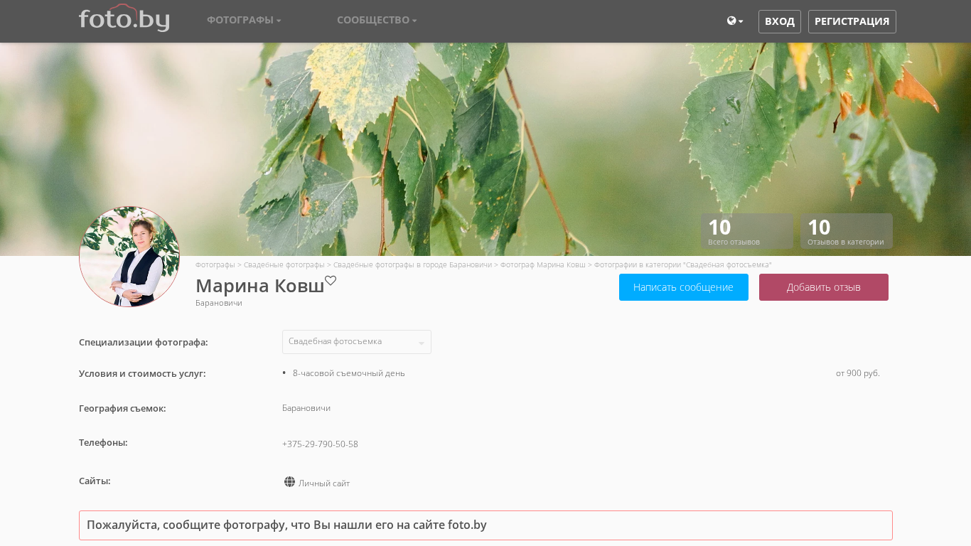 | SEO-описание | Фотографии в категории "Свадебная фотосъемка". Фотограф Марина Ковш - выполняю следующие виды фотосъемок: свадебная фотосъемка. Работаю в городах: Барановичи, Несвиж, Ганцевичи, Минск, Брест, Гродно, Солигорск. |