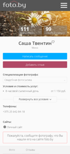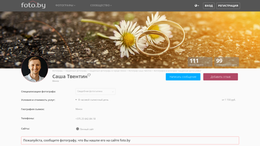 | AI-анализ | The website is a photography portfolio of Sasha Tventin, based in Minsk, Belarus. The website primarily showcases his work in the "Wedding Photography" category, with a focus on lively, emotional, and sincere images. Saasha Tventin's photography services are available in Minsk, and he offers an eight-hour photo shoot starting from 1,150 rubles. His photography style includes wedding and family portraits, as well as children's photography in a daycare setting. The website also features a blog, contact information, and a selection of testimonials from clients. |
