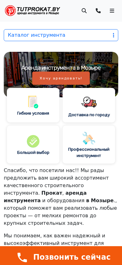 | SEO-описание | Большой выбор строительного инструмента в аренду и на прокат в г. Мозырь на выгодных условиях. Доставка по городу. |