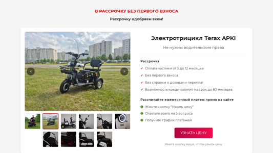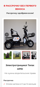 | AI-анализ | The web project 'Rassrochka bez pervogo vznosa' (Loan without the first payment) is a loan service website that offers loans without the initial payment. The website provides information about a product called 'Терраксплюс Электротрицикл Terax APKI' (Terrax APKI Electric Tricycle), which can be purchased with a loan. The loan can be repaid in installments from 3 to 12 months. The website also states that the loan does not require a first payment, income verification, or down payment. The loan term can be extended up to 60 months. Visitors can calculate the monthly payment on the site by clicking the 'Узнать цену' (Find Price) button and answering three questions. The website also includes information about the company 'ООО «Тераксплюс»' |