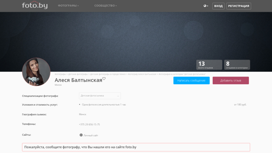| AI-анализ | The web project "Фотограф Алеся Балтынская" is a photographer's website based in Minsk, Belarus. The site focuses on children's photography, as indicated by the category label in the title. The photographer, named Alesya Baltynskaya, offers her services as a children's photographer, family photographer, and photographer for New Year's photo sessions in Minsk. The site includes a community of photographers and a catalog of photographers, with Alesya's profile and portfolio featured. The site also offers information on the conditions and pricing for her services, which include a one-hour photo session starting at 180 rubles. The site includes contact information, including a phone number and personal site link. The site has received 13 reviews in total, with a focus on children's photography and New Year's photo sessions. The |