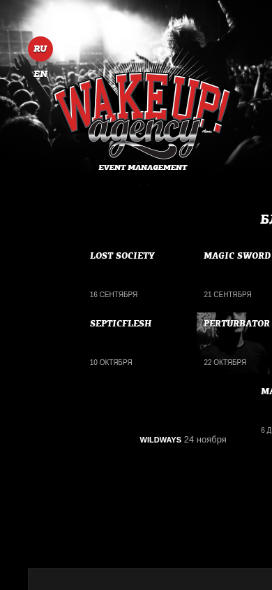 | AI-анализ | This online resource is a Belarusian event organization agency named Wake Up! Agency, specializing in organizing concerts and events. Keywords associated with the website include "wake," "agency," "concerts," "events," and various dates, primarily in the months of September, October, and November. The website provides a list of upcoming events, including Lost Society on September 16th, Magic Sword on September 21st, Dimmu Borgir on September 29th, Children Of Bodom on October 4th, Purgen on October 5th, Septicflesh on October 10th, Perturbator on October 22nd, Lera Lynn on November 7th, Oomph! on November 13th, Amenra on November 15th, Wildways on November 24th, and Petly |