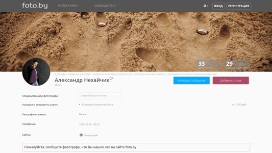 | AI-анализ | This online resource is a photography website belonging to Alexandr Nehaichik, based in Minsk, Belarus. The site primarily showcases photographs in the "Свадебная фотосъемка" (wedding photography) category. Alexandr Nehaichik offers his photography services in the cities of Minsk, Moloodechnoy, and Vilaya as a wedding photographer. |