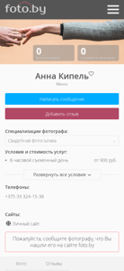 | AI-анализ | This online resource is a photography website belonging to Anna Kipeel, a photographer based in Minsk, Belarus. The website primarily features photographs in the "Свадебная фотосъемка" (Wedding Photography) category. Anna works as a wedding photographer, children's photographer, and portrait photographer in the cities of Minsk, Bobruisk, and Molodecnco. The website provides information about her services, pricing, and contact details. |
