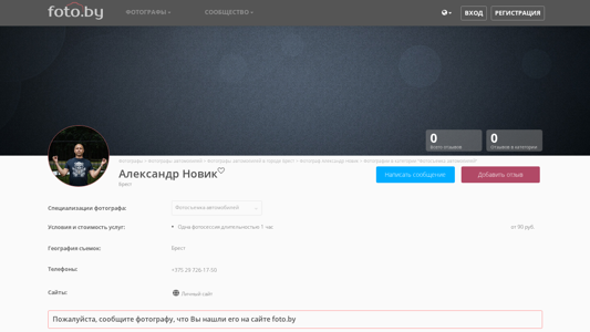| AI-анализ | The web project "Photolynx.foto.by" is a photography site by Alexander Novik based in Brest, Belarus. The site features a category dedicated to car photography. The photographer offers his services in the cities of Cobrin and Brest. Keywords associated with the site include 'photography', 'photographer', 'Brest', 'car photos', and 'Alexander Novik'. The site includes a community of photographers, a blog, and a search function. The site was last accessed on June 5, 2025, and has received no reviews in the car photography category. The photographer specializes in car photography, as well as children and individual photo sessions. Pricing starts at 90 rubles for a one-hour session. The site includes contact information, including a phone number and personal website. The photographer can be reached through the site or by |