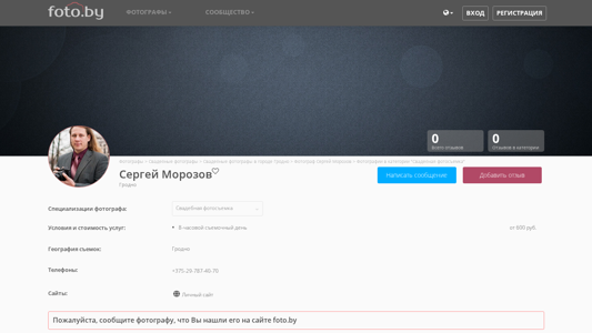 | AI-анализ | This website belongs to photographer Sergei Morozov from Grodno, Belarus. The main focus of the site is showcasing his work in the "Wedding Photography" category. The site includes a catalog of photographers, where Sergei's page can be found. The photographer offers his services as a wedding and teaching photographer in Grodno. The site also features a community for photographers, but the homepage defaults to the catalog page. The site includes sections for various types of photography, such as portrait, industrial, and reclusive photography, as well as a blog and a section for reviews of photographers. The site was visited on May 31, 2022, and there are currently no reviews in the wedding photography category. The photographer's specializations include wedding photography and photography education. The pricing and service details include an 8-hour shooting day starting at 60 |