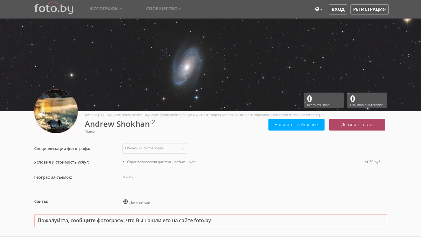 | SEO-описание | Фотографии в категории "Обучение фотографии". Фотограф Andrew Shokhan - выполняю следующие виды фотосъемок: обучение фотографии, предметная фотосъемка, рекламная фотосъемка. Работаю в городах: Минск |