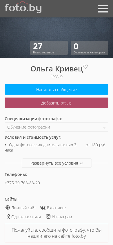 | AI-анализ | The web project "Фотограф Ольга Кriвец, Гродно" is a photography website by Olga Krivec based in Grodno, Belarus. The site features a category dedicated to "Обучение фотографии" (photography education). Olga specializes in family walks and baptisms in the cities of Grodno, Skiidel, Brest, and Ivanovo. Keywords associated with the site include "фотографии" (photographs), "фотограф" (photographer), "обучение" (education), and "фотосъемка" (photoshoot). |