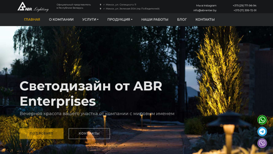 | AI-анализ | The website is dedicated to lighting fixtures, installation, components, and lighting design offered by ABR Enterprises. The company has an official representation in the Republic of Belarus, located in Minsk at Ul. Selitskogo 11 and Ul. Zelenaya 30A (Pr. Poбедителей). The website provides contact information, including phone numbers +375 (29) 771-96-94 and +375 (17) 399-72-91, as well as an Instagram account (info@abrenter.by). The site features sections on company information, services (lighting design, project planning and implementation for architects and designers), and products (lighting fixtures, transformers and lamps, accessories, and lighting control systems). The website also includes a blog, a portfolio of their work, and |