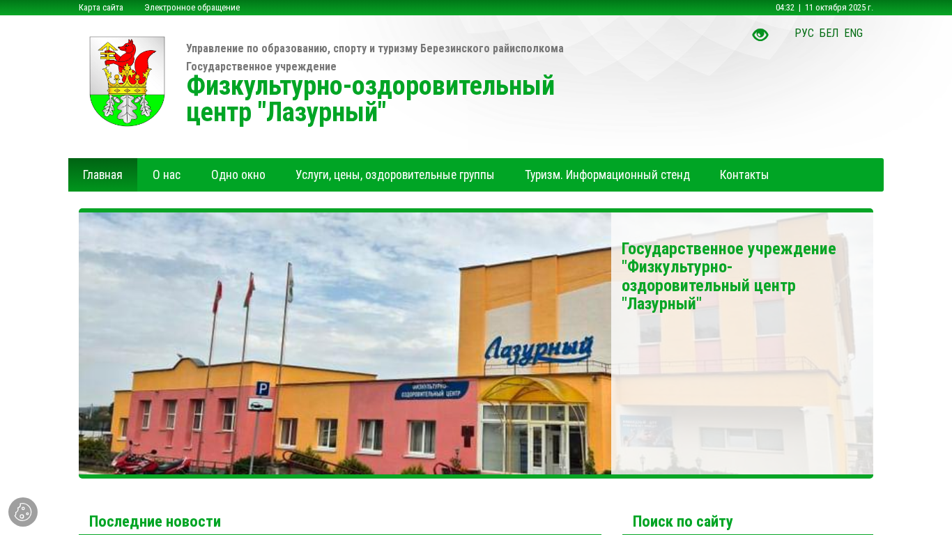| AI-анализ | The web project "ГУ "Физкультурно-оздоровительный центр "Лазурный" (State Educational Institution "Lazuarny Sports and Recreation Centre") is managed by the Education, Sports and Tourism Department of Berezino District Executive Committee. The site offers information in Belarusian and Creole languages. The title includes the name of the center and its administrative status. The description includes relevant keywords such as "state", "educational institution", "sports", "recreation", and "centre". The top words indicate the most frequently used phrases, including the name of the center and the location in October 2025. The site map includes an electronic application feature, and the server log shows an access at 04:32 on October 11, 2025. The domain name is "laz |