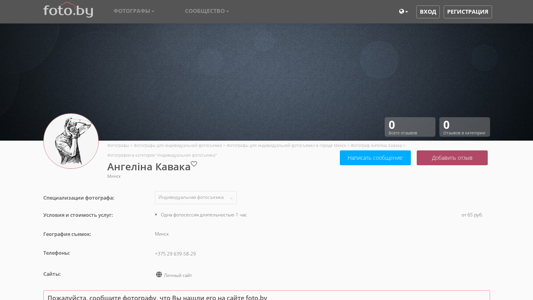 | AI-анализ | --- This website belongs to photographer Angelina Kavaka from Minsk, Belarus. The main focus of the site is on individual photo sessions, as indicated by the title and the category label in the meta data. The description also confirms this, stating that the photographer works in individual photography, product photography, and creates visuals for social media sets. The keywords and top words further emphasize this, with words like "individual", "photography", and "photo session" appearing frequently. The site is part of the Foto.by community, which is indicated by the presence of the Foto.by logo and links in the footer. The site includes a blog, a contact form, and information about the photographer's services and pricing. The photographer can be reached via phone or email, and their personal website is also provided. The site is primarily in Russian, with some Belarusian language |