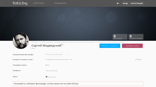 | AI-анализ | --- This website belongs to photographer Sergei Medvedsky from Minsk, Belarus. The main focus of the site is on interior photography, as indicated by the title and the category description. The photographer offers his services as a Love Story, children, and wedding photographer in Minsk. The site includes a catalog of photographers, a community of photographers, and a blog. The statistics show that the website was last visited on August 28, 2025, with no reviews in the interior photography category. The photographer's specialization is in interior photography, and the conditions and pricing for his services include a one-hour photo session starting at 80 rubles. The photography shoots take place in Minsk. The website includes contact information, including a phone number and a personal site. Users are encouraged to inform the photographer that they found him on foto.by. The site also includes a portfolio of |