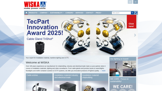 | AI-анализ | language: en This website is the English version of WISKA, a company specializing in supplying installation material, maritime lighting, and CCTV for various industries including maritime, shipbuilding, offshore facilities, electrical trade, and transport engineering. With over 100 years of experience as a manufacturer, WISKA offers innovative and high-quality products such as cable glands, junction boxes, reefer container sockets, and CCTV systems. The website provides information on WISKA's history, sustainability, and environmental responsibility. It also offers services like a 3D/CAD product catalogue, venting calculator, and product finder. WISKA has multiple international branches, including in Germany, America, Brazil, China, Ibérica, India, Korea, and the UK. |