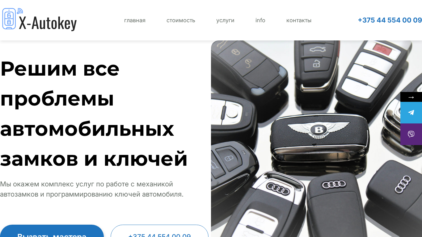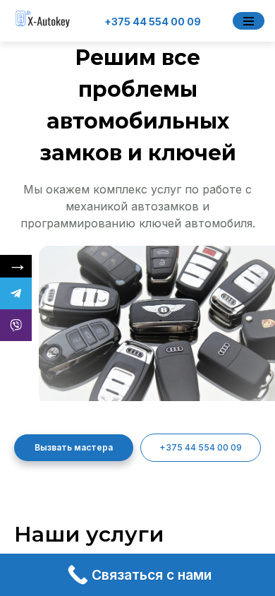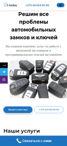 | AI-анализ | The web project "x-autokey.by" is a service offering comprehensive solutions for automotive lock issues and key programming for cars. The description highlights their ability to resolve all car lock and key problems, and provides contact information for customers to call and request services. The main services listed include key repair, removal and installation of locks, replacement of key bodies, and disabling alarm systems. The website also offers services for creating new car keys, including those with chips, and fabricating keys using CNC machines. Prices for various services are given, including a discounted rate for nighttime calls and a flat fee for master visits. The site boasts over 3,800 keys produced and 10 years of experience in the industry. |