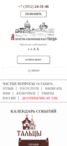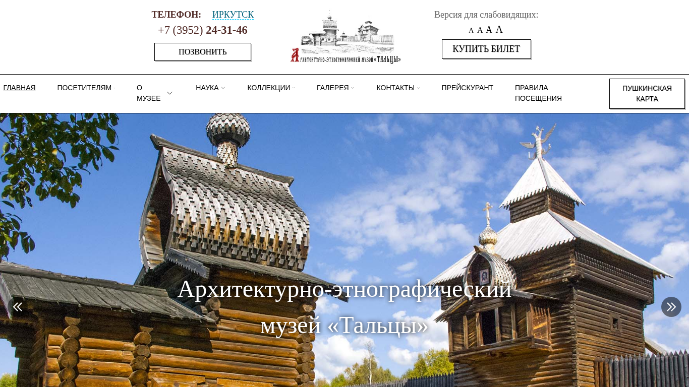 --- This website is for the architectural-ethnographic museum "Talcy" located in Irkutsk, Russia. The title of the website is "Тальцы" which translates to "Talcy" in English. The museum offers various services including guided tours, master classes, audio guides, and interactive programs. Visitors can find information about the museum's history, exhibitions, collections, and upcoming events on the website. The museum also has a cafe and an electronic passport system for easier access. The calendar of events lists various activities taking place throughout the year, including cultural programs for schools and special events. The website includes sections for media coverage, job opportunities, and downloadable documents such as the museum's charter and historical information. The website is accessible from Monday to Sunday, 10:00 to 18:00. The museum offers various concerts, exhibitions