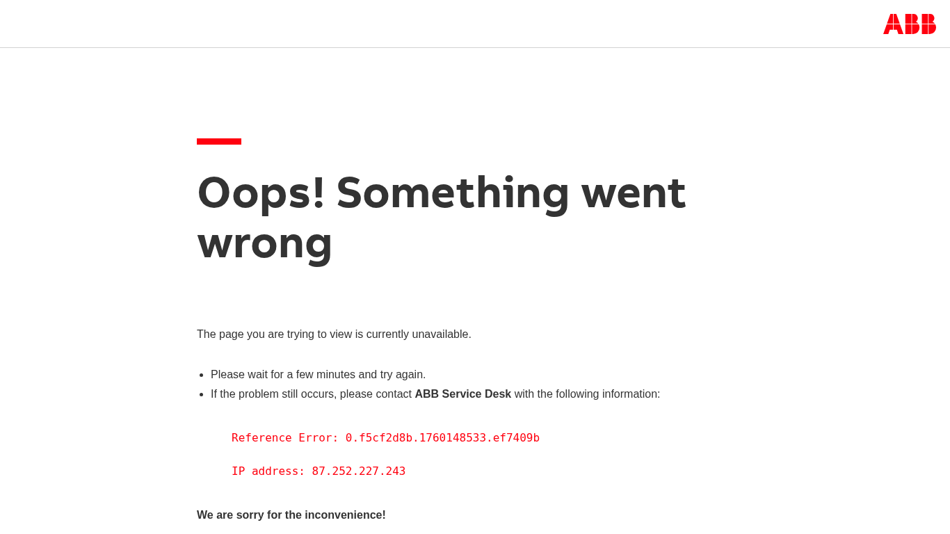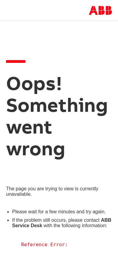 | AI-анализ | The web project "Site Error" is a webpage on new.abb.com that informs users when they encounter an error while trying to view a page on the site. The page includes a message that the page they are trying to access is currently unavailable and asks users to wait for a few minutes and try again. If the problem persists, users are instructed to contact the ABB Service Desk for assistance, providing the error reference number and their IP address. The page title is "Site Error" and the description is blank. The top keywords for this webpage are "error," "please," "for," "site," "you," "trying," "view," and "currently." The unparsed fragment includes instructions for users to contact the ABB Service Desk for assistance and provides an error reference number and IP address. |