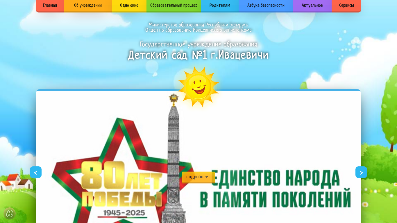 | AI-анализ | The website is for a kindergarten in Ivacevichi, Belarus, named 'Detsky sad #1'. The site provides comprehensive information about the kindergarten, including its leadership, staff, admission procedures, history, and various educational and social initiatives. Key topics covered include safety, conditions, availability of places, news, and educational programs. The site offers interactive features such as an 'information window', a virtual methodological cabinet, and a project on the 'sign of quality'. It also includes a section on 'helpful organizations' and links to various educational and support resources. The site's design is organized into sections, with details on work hours, contact information, and application procedures. The site is operated by the Ivacevichi city education authority and is part of the 'rooivacevichi.gov.by' domain. |