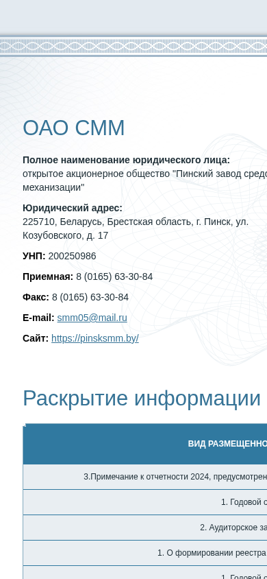 | AI-анализ | The portal СММ ОАО (Smart Machinery Enterprise Pinsk OAO) is a Belarusian company located in Pinsk, Brest Oblast, with the legal address at ul. Kozubovskogo 17. The organization is engaged in manufacturing small machinery and offers various financial reports for download, including annual reports and auditor's conclusions from 2017 to 2025. The website provides access to a personal cabinet for registered users, allowing them to log in with an email address and password. Reports are available for download in PDF format. |