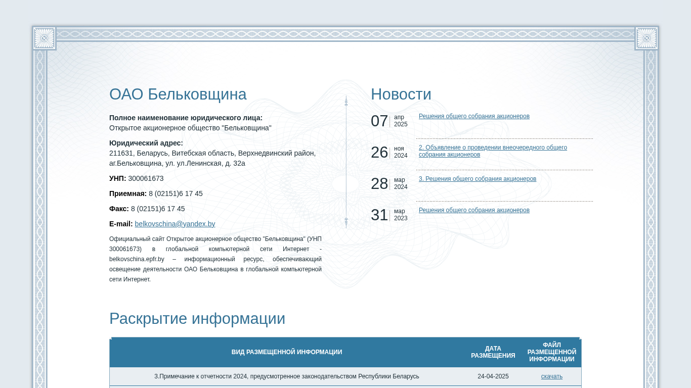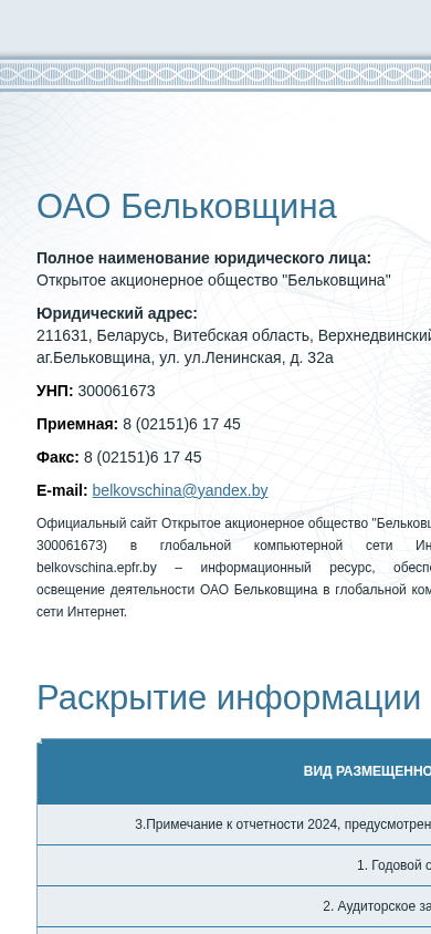 | AI-анализ | The web project "Бельковщина ОАО" (Open Joint Stock Company "Belkovschina") is a Belarusian corporate website, located at belkovschina.epfr.by. It is an informational resource that provides coverage of the activities of the company in the global computer network Internet. The website includes various documents related to the company's operations, such as annual reports, auditor's reports, and registration information for shareholders. The most frequently used keywords on the site include "скачать" (download), "формировании" (formation), "реестра" (registry), "владельцев" (owners), "ценных" (valuable), "бумаг" (papers), "годовой" (annual), "отчет" (report), "аудиторское" (auditor's), and  |