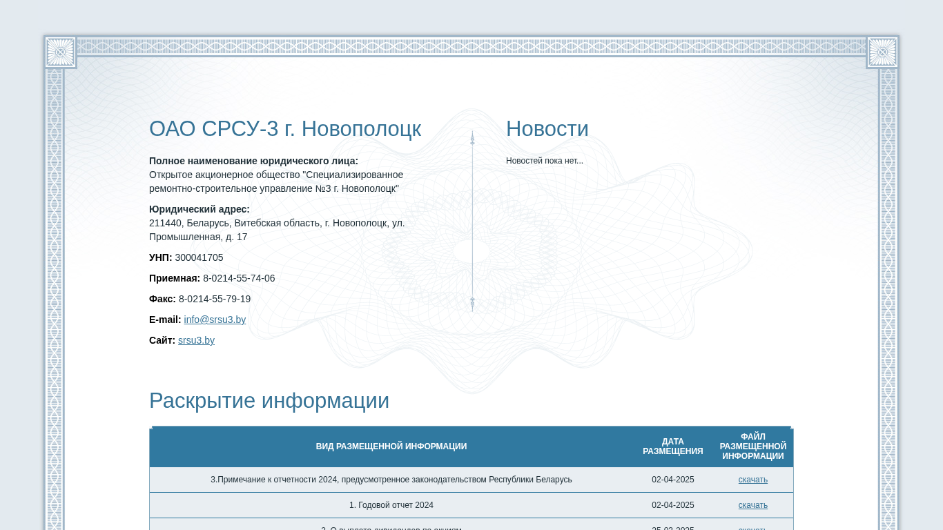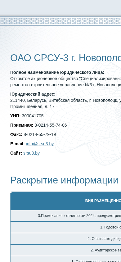 | AI-анализ | This online resource is the official website for Open Joint Stock Company (OJSC) "Specialized Repair and Construction Management No.3 in the city of Novopolotsk" (SRSU-3). The website provides access to various financial reports and documents required by Belarusian legislation, such as annual reports, auditor's reports, and dividend payment information. Users can download these documents in PDF format, with available years ranging from 2018 to 2025. The website also includes a section for forming and maintaining a registry of shareholders and beneficial owners, with available data from 2011 to 2021. The website's URL is srsu3.by, and contact information includes a phone number, fax, and email address for inquiries. There are currently no news articles available on the site. |