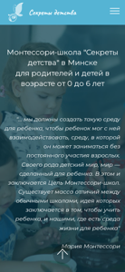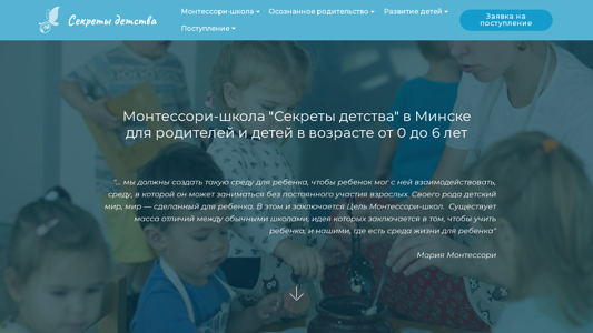 | AI-анализ | --- This online resource is dedicated to Monteessori-school "Secrets of Childhood" in Minsk, Belarus. The school offers consultations, seminars, and master-classes for parents and children aged from 0 to 6 years. The Montessori method, founded by Maria Montessori, emphasizes creating an environment for the child to interact with, allowing the child to explore and learn independently. The school offers Montessori classes for children from 4 months to 14/16 months (Nido), 14/16 months to 3 years (Toddler), and 3 to 6 years (Casa dei Bambini). The Montessori approach values and loves every child, and all school activities adhere to AMI standards, ensuring quality Montessori development worldwide. |