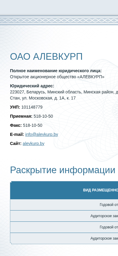 | AI-анализ | The web project "АЛЕВКУРП ОАО" (Open Joint Stock Company "АЛЕВКУРП") is a Belarusian business entity with the legal name "Открытое акционерное общество «АЛЕВКУРП»" (Open Joint Stock Company "АЛЕВКУРП"). The company's headquarters is located at ул. Московская, д. 1А, к. 17, Королёв Стан, Минский район, Минская область, 223027, Belarus. The contact details provided are a phone number 518-10-50, a fax number 518-10-50, and an email address info@alevkurp.by. The company |