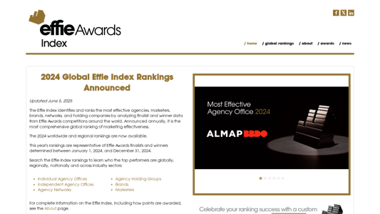 | AI-анализ | language: en The portal Effie Index is a comprehensive global ranking of marketing effectiveness. It identifies and ranks the most effective agencies, marketers, brands, networks, and holding companies by analyzing finalist and winner data from Effie Awards competitions around the world. The annual rankings are based on points awarded to agencies, marketers, brands, networks, and holding companies for their Effie Award-winning campaigns. The portal provides access to the worldwide and regional rankings, as well as rankings by industry sectors and individual agency offices, independent agency offices, agency networks, and agency holding groups. The Effie Index is a valuable resource for marketers and industry professionals seeking to identify top performers in the field of marketing effectiveness. |