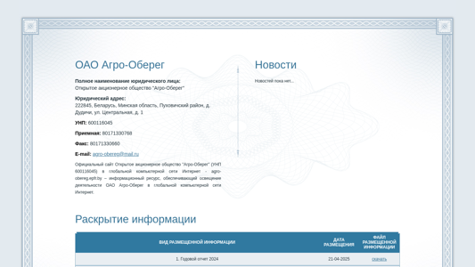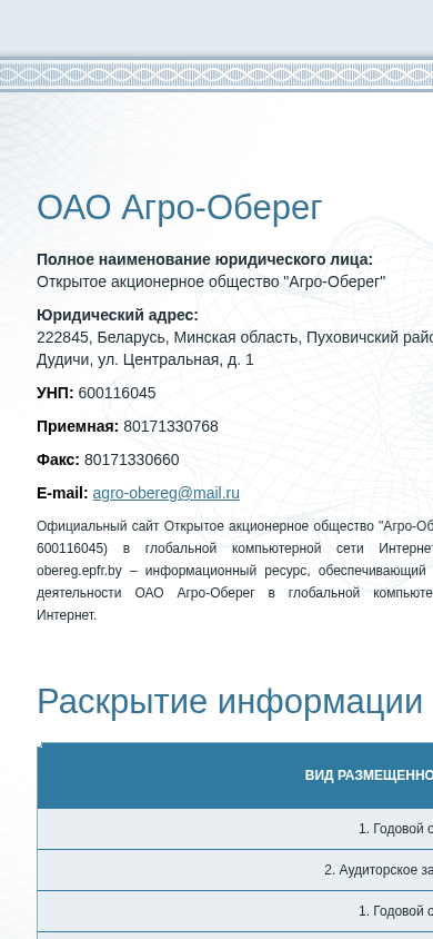 | AI-анализ | This website is the official online presence of Open Stock Corporation (OAO) "Agro-Obereg" (UNP 600116045), located in Belarus, at the address: 222845, Минская область, Пуховичский район, д. Дудичи, ул. Центральная, д. 1. The site provides information about the company's activities in the global computer network Internet. Available downloads include annual reports and auditor's reports for the years 2023, 2022, and 2021. Users can access a personal cabinet using an email address and password. |