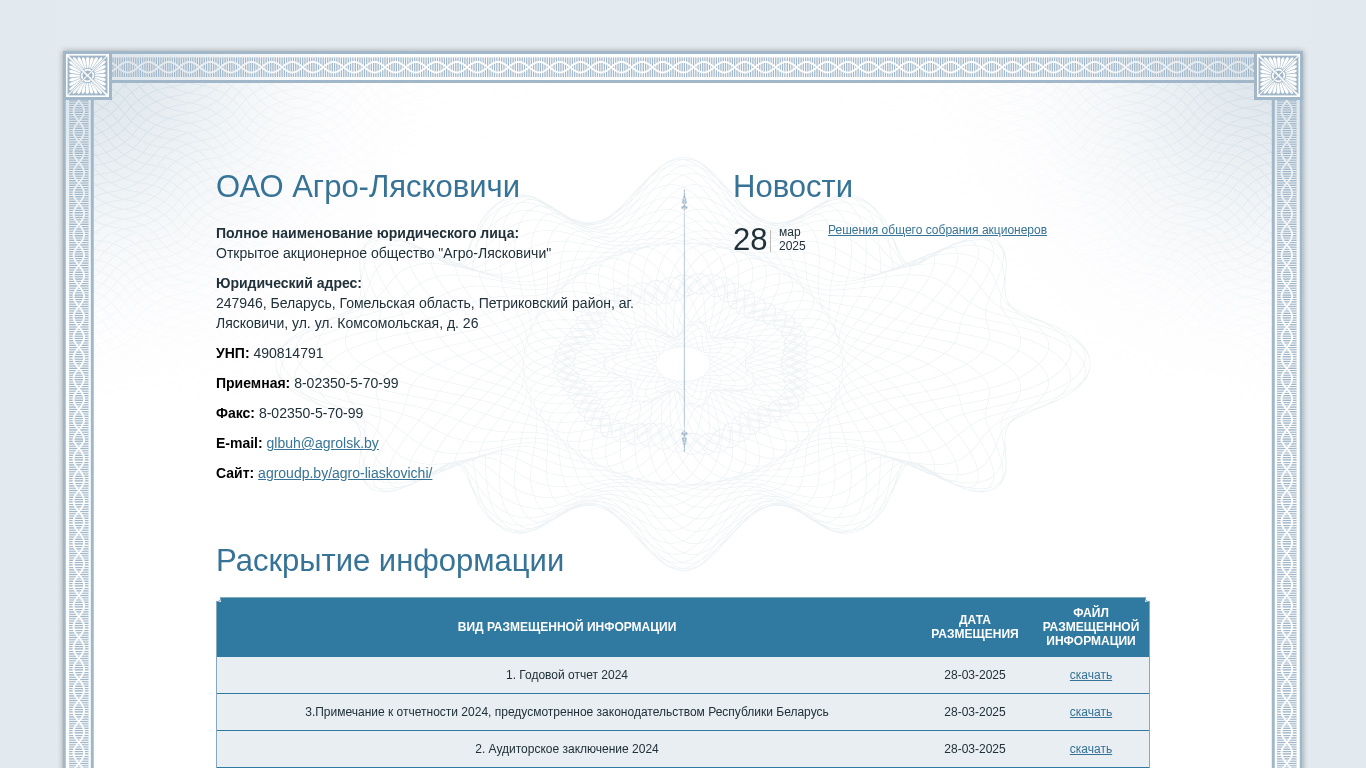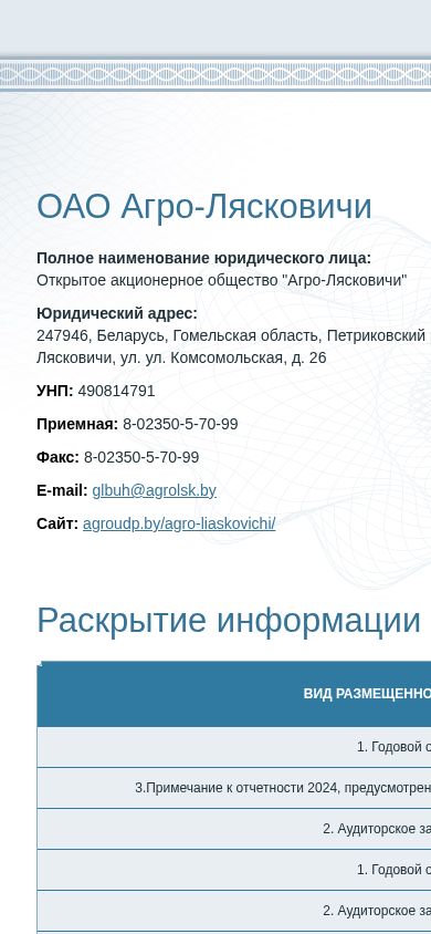 | AI-анализ | The website Agro-Lясковичи OAO (Open Joint Stock Company Agro-Lясковичи) provides annual reports, auditor's conclusions, and information on dividend payments for the years 2020 to 2025. Users can download these documents in PDF format. The website also includes a section for news, with the latest update on March 28, 2025. The company's full legal name is "Open Joint Stock Company Agro-Lясковичи," and its legal address is in Belarus, Petrikovsky district, Lяskoвичи village, Komsomoskaya Street, house 26. The contact details provided are a phone number and an email address. The website is developed by epfr.by. |