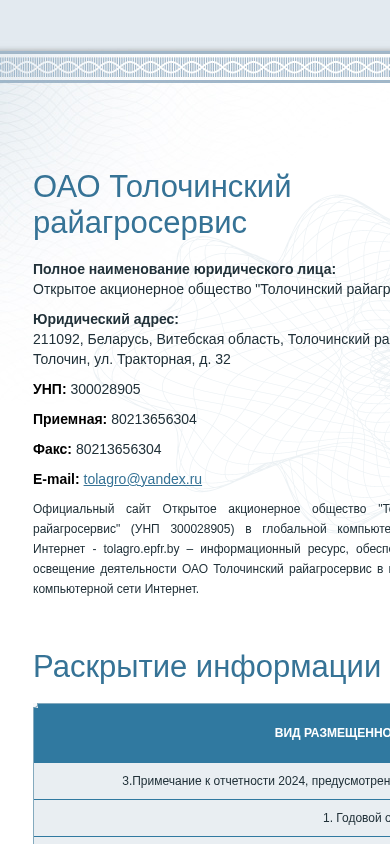 | AI-анализ | This online resource is the official website of Open Joint Stock Company (OJSC) "Tolochinsky Rayagroservis" in Belarus. The site, tolagro.epfr.by, provides information about the activities of the company in the global computer network Internet. The website includes downloadable annual reports and auditor's reports from 2017 to 2024, as well as information on how to register as a shareholder. Users can access the personal cabinet with an email and password. The site is developed by epfr.by. |