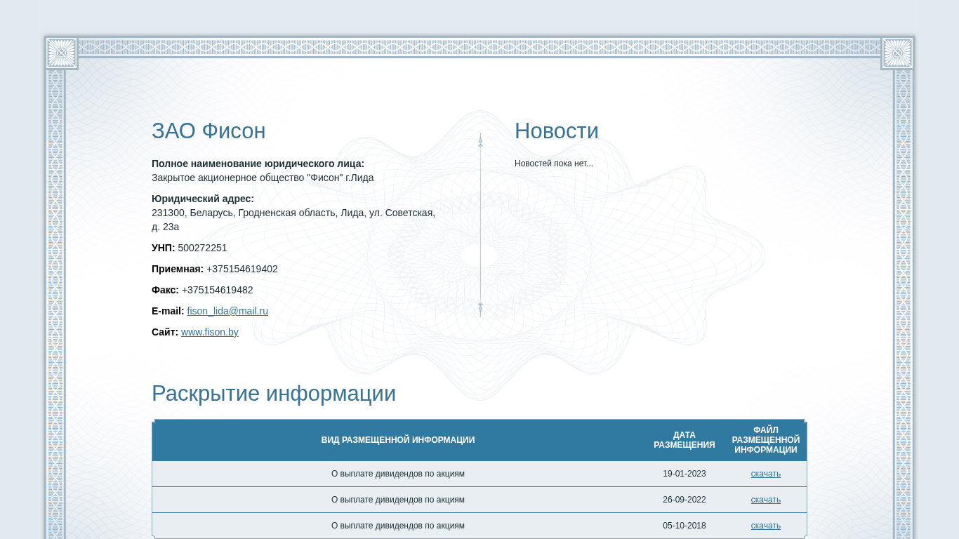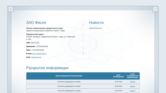 | AI-анализ | This website, titled "Фисон ЗАО," is a business website for the closed joint-stock company "Фисон" based in Лида, Гродненская область, Belarus. The company's full legal name is "Закрытое акционерное общество 'Фисон'" and its registered address is ул. Советская, д. 23а, 231300, Belarus. The website provides information on dividend payments, with files available for download from 19-01-2023, 26-09-2022, and 05-10-2018. The site also includes a link to register and log into a personal cabinet using an email address and password. The website was developed by epfr.by. No news section is present on the site |
