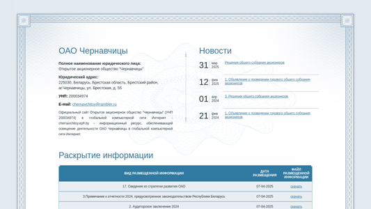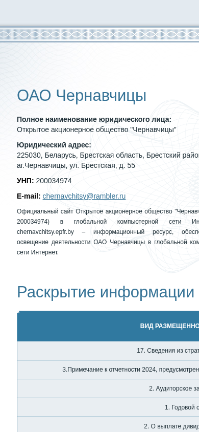 | AI-анализ | The website chernavchitsy.epfr.by is the official online resource for Open Joint Stock Company (OJSC) "Chernavchytsy" (UNP 200034974), located in Belarus, Brest region, Brest district, the village of Chernavchytsy. The site provides information on the company's activities in the global computer network Internet. It features announcements of general shareholder meetings, including their dates and agendas, as well as the resolutions passed during these meetings. Additionally, the site offers downloadable reports, such as the annual report for 2024, auditor's report, and information on dividend payments and the share register. |