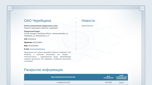 | AI-анализ | The web project "Черейщина ОАО" (Open Joint Stock Company "Chereyshchina") is a Belarusian information resource, providing insight into the activities of the company in the global computer network Internet. The website, located at chereyschina.epfr.by, offers access to the organization's annual reports, contact information, and no current news updates. The domain is registered under the .BY extension and was last updated on April 30, 2025. The company's UNP number, 300039150, is also provided. The website is developed by epfr.by. |
