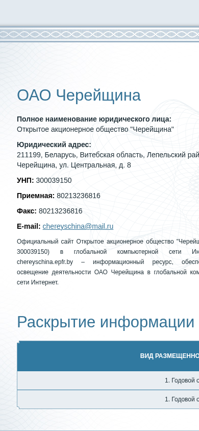 | SEO-лексика | черейщина оао пароль e-mail информации открытое акционерное общество адрес унп 300039150 80213236816 chereyschina глобальной компьютерной сети интернет epfr размещенной годовой |