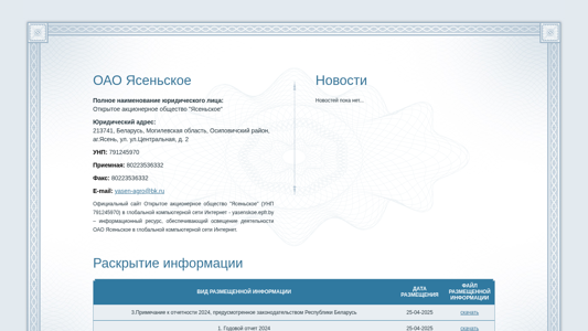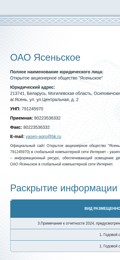 | AI-анализ | The portal is a website for Open Joint Stock Company (OJSC) "Jasenskoe" (UCN 791245970). It provides information about the company's activities in the global computer network Internet. The website contains news and offers access to annual reports for download, including the 2023 and 2024 reports. Users can also register for a personal account using an email address and password, or recover a lost password. The site is developed by epfr.by. |