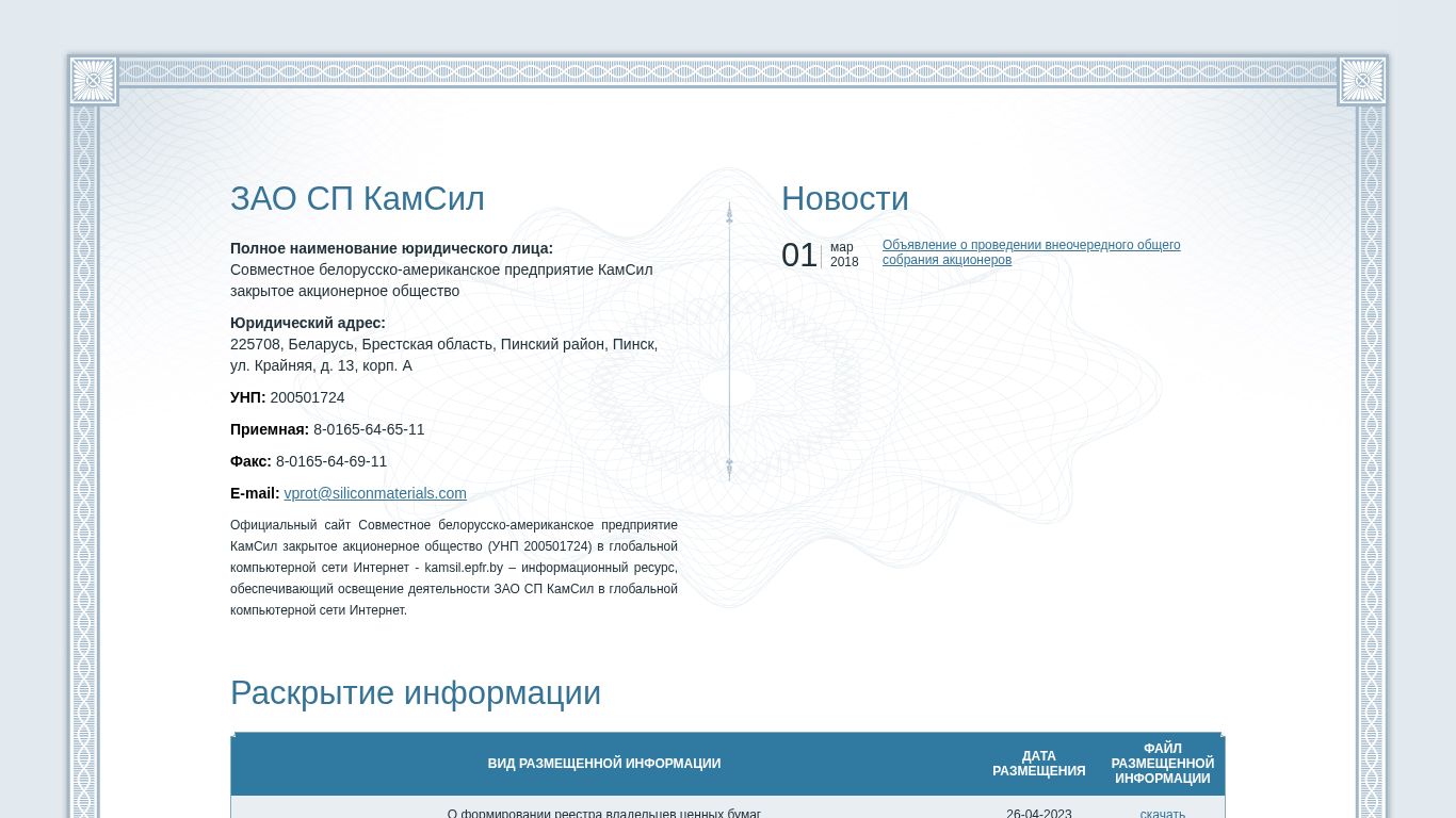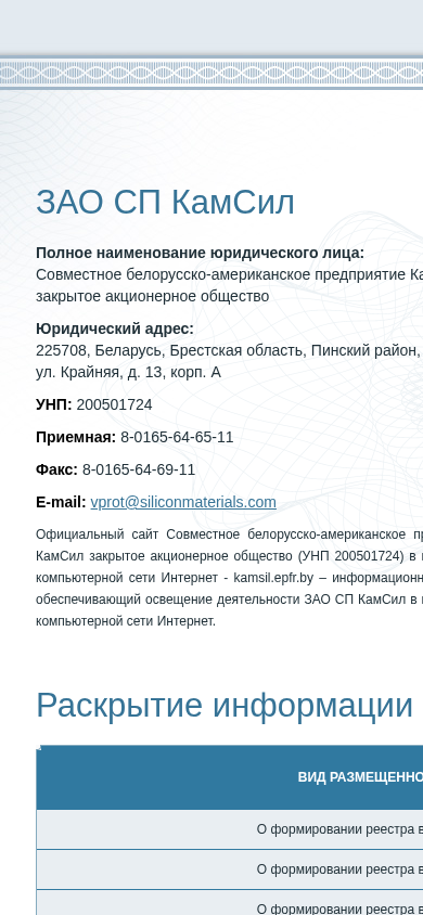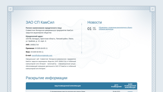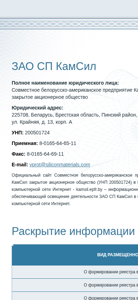 | AI-анализ | --- This online resource is the informational website for ЗАО СП КамСил (Closed Joint Stock Company KamSil), a Belarusian-American joint venture. The site provides information about the company's activities in the global computer network Internet. The main topics covered include announcements of shareholder meetings and the publication of shareholder registry forms for various dates. These forms can be downloaded from the website. Other topics include information on significant transactions involving affiliated parties and large transactions. The site was developed by epfr.by and requires email and password for access to the personal cabinet. |