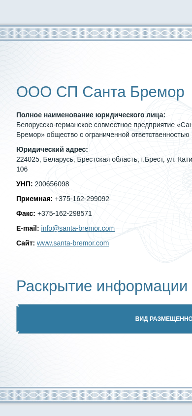 | AI-анализ | The web project "СП Санта Бремор ООО" is a Belarusian limited liability company named "Santa Bremor" with a German partner, registered at the address 224025, Belarus, Brest Region, Brest, ul. Katyn Bor, d. 106. The company's contact details include a phone number (+375-162-299092), a fax number (+375-162-298571), and an email address (info@santa-bremor.com). The website, located at santa-bremor.epfr.by, is developed by epfr.by and currently does not have any news available. Users can access a personal cabinet by providing an email address and password. The keywords associated with the project are "па |