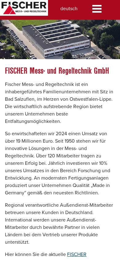 | SEO-описание | FISCHER Mess- und Regeltechnik GmbH ist ein inhabergeführtes Familienunternehmen und gehört europaweit zu den führenden Herstellern innovativer Produkte und kundenspezifischer Anwendungslösungen für viele Industriebereiche, z.B. Messung von Druck, Differenzdruck, Temperatur, Durchfluss sowie Füllstand. |