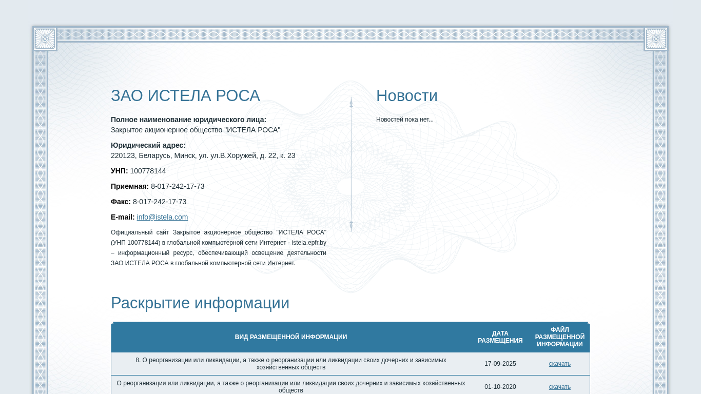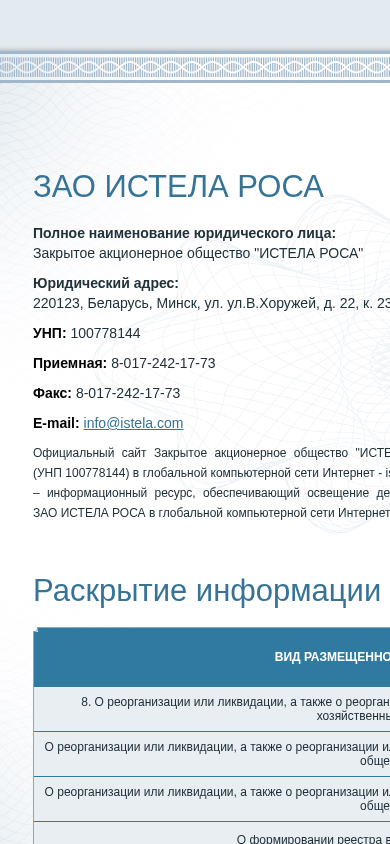 | AI-анализ | The website is the official online presence of Closed Joint Stock Company "Istela Rosa" (UNP 100778144), located in Minsk, Belarus. It provides information on the company's activities in the global computer network Internet. The site contains news on reorganizations or liquidations, as well as reorganizations or liquidations of their dependent and affiliated economic societies, dated 01-10-2020, 20-08-2020, and 17-09-2025. Additionally, there is a link for access to the shareholder register formation. The site was developed by epfr.by. |
