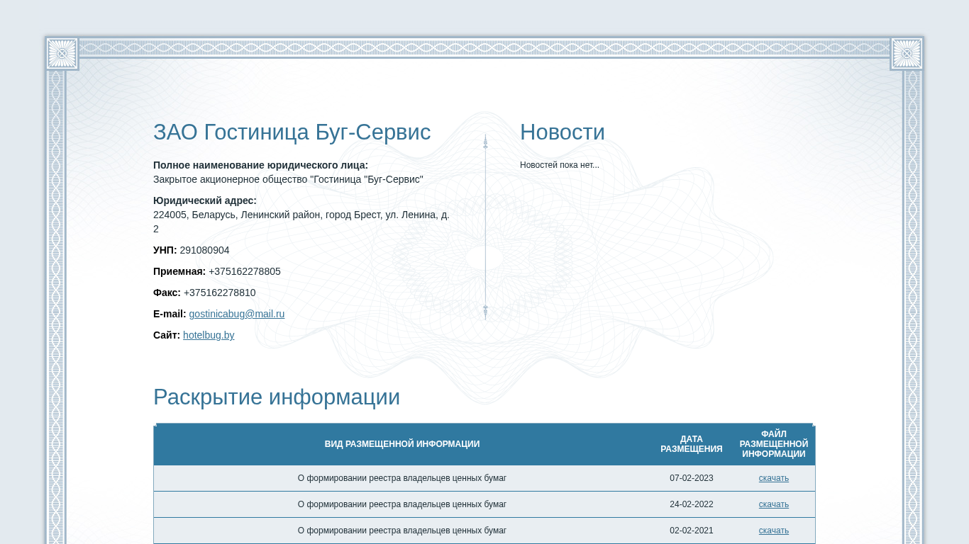 | AI-анализ | The portal 'Hotel Bug-Service ZAO' is a website for a closed joint-stock company named 'Hotel Bug-Service' located in Belarus, Brest, Lenin Street, No. 2. The site provides information on the formation of the shareholder register, with available downloads for records from February 2021 to February 2023. Users can access their personal cabinets using an email address and password. The site was developed by epfr.by and is accessible at hotelbug.by. |