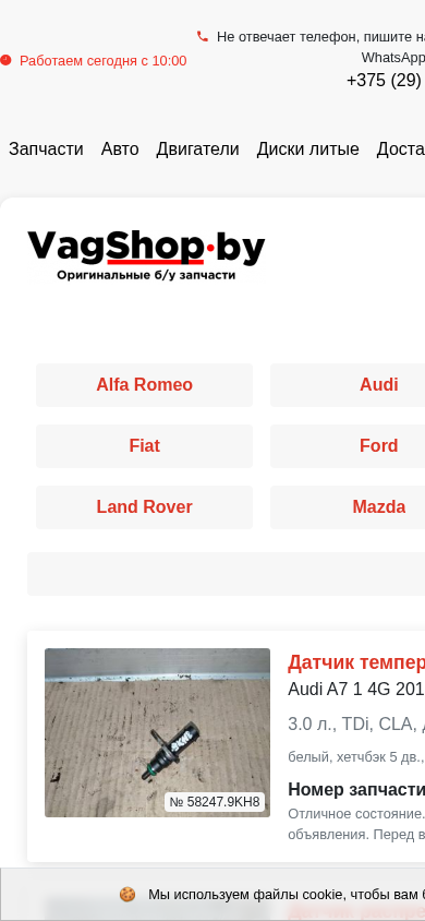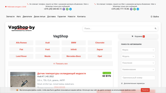 | AI-анализ | --- The website VagShop is an online marketplace for used automotive parts in Belarus, specifically in Minsk. With over 25,725 used parts available, it offers a wide selection of items for various makes and models, including Audis, Alfa Romeos, BMWs, and more. The site includes categories for engines, transmissions, wheels, and more, with options for delivery, warranty, and news. The interface is available in both Russian and English, and users can contact the seller via Viber with the specified article number for inquiries. The site also features a shopping cart function and a list of available parts with their respective conditions, states of origin, and prices. The domain is registered as vagshop.by. |
