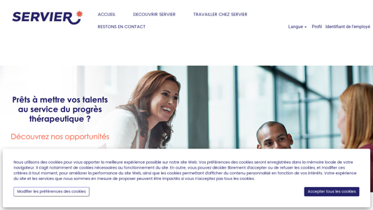 | AI-анализ | --- This website, jobs.servier.com, is primarily about employment opportunities. The title is "Jobs at Servier" and the description reads, "We use cookies to offer you the best possible experience on our Web site. Your cookie preferences will be saved in your browser's local memory. This includes essential cookies for site functionality and optional cookies for site performance and personalized content based on your interests. Your site experience and the services we can offer may be affected if you do not accept all cookies. Change cookie preferences Accept all cookies Tab key for link selection Go to content. Go to main content Home Discover Servier Work with us Stay in touch Language Arabic (Saudi Arabia) Deutsch (Germany) English (United Kingdom) English (United States) Spanish (Spain) French (France) Hungarian (Hungary) Italian (Italy) Polish (Poland) Portuguese (B |