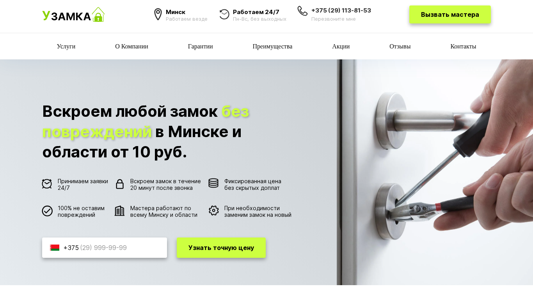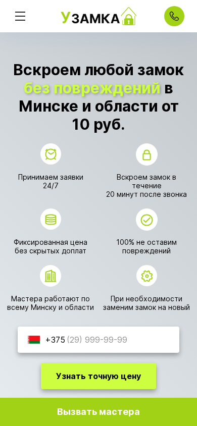 | SEO-описание | Вскроем любой замок без повреждений в Минске и области от 10 руб. Принимаем заявки24/7Вскроем замок в течение20 минут после звонкаФиксированная ценабез скрытых доплат100% не оставимповрежденийМастера работают по всему Минску и областиПри необходимостизаменим замок на новый Стоимость услугОзвучим точную цену по телефонуСтоимость зависит от степени защищенности замка. Точную цену определит диспетчер или мастер на месте после |