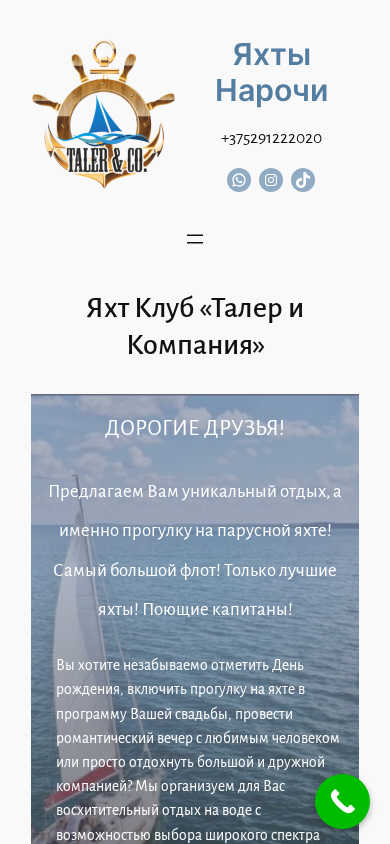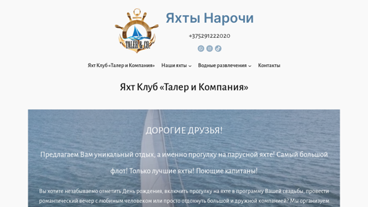 | AI-анализ | The website is for Yacht Club 'Taler and Company' offering boat tours in Belarus, specifically on Lake Naroch. The title and description suggest a club that provides boat rides on various yachts, with a focus on paraus sailing boats. The top words indicate popular keywords such as 'yacht', 'sailing', 'boat ride', and 'rental'. The website also mentions various yachts by name, including 'White Princess', 'Zielone', 'Marusenka', and 'Santa-Maria'. Users can contact the club via WhatsApp, Instagram, TikTok, or phone. The website offers various water activities including boat rentals, catering, hydrocycles, catamarans, and sup boarding. The description encourages visitors to celebrate special occasions such as birthdays and weddings on the yachts. The website is built on WordPress and |